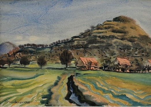 Franz Pruckner könnte ein Absolvent der Salzburger „Schule des Sehens“ gewesen sein, wo es um Spontanmalerei treffsicher frei aus dem Handgelenk heraus und auf die Natur hin geht. Darin beweist er Meisterschaft auf seinen mit Elan hingezauberten, großzügig aufgefassten, expressionistisch stimmungsschweren Landschaftsaquarellen.