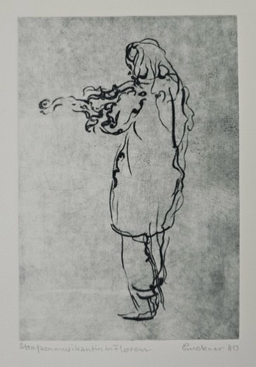 Temperamentsverwandtschaft mit Kokoschka, zu dem es keine direkte Beziehung gab, verraten dann wieder mehr die knappen, bündig – direkten Figurenzeichnungen und Portraits.Pruckner, der allzu bescheiden, nie viel aus sich machte, sich vom Modegeschrei des Kunstbetriebs abschrecken ließ – bekennt sich als Augenmensch, als einer der aufgeht im nachgerade entrückten Sehen und Schauen – als „ Der Staunende“.